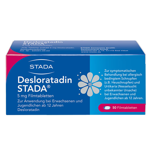 Anwendungsgebiete: Desloratadin STADA® bessert die Symptome bei allergischer Rhinitis (durch eine Allergie hervorgerufene Entzündung der Nasengänge, beispielsweise Heuschnupfen oder Hausstaubmilben-Allergie). Diese Symptome beinhalten Niesen, laufende oder juckende Nase, Juckreiz am Gaumen und juckende, gerötete oder tränende Augen. Es wird ebenfalls angewendet zur Besserung der Symptome bei Urtikaria (ein durch eine Allergie hervorgerufener Hautzustand). Diese Symptome beinhalten Juckreiz und Quaddeln. Die Besserung dieser Symptome hält einen ganzen Tag an und hilft Ihnen, Ihre normalen Alltagsaktivitäten wieder aufzunehmen und Ihren Schlaf wiederzufinden. Wenn Sie sich nach 10 Tagen nicht besser oder gar schlechter fühlen, wenden Sie sich an Ihren Arzt.