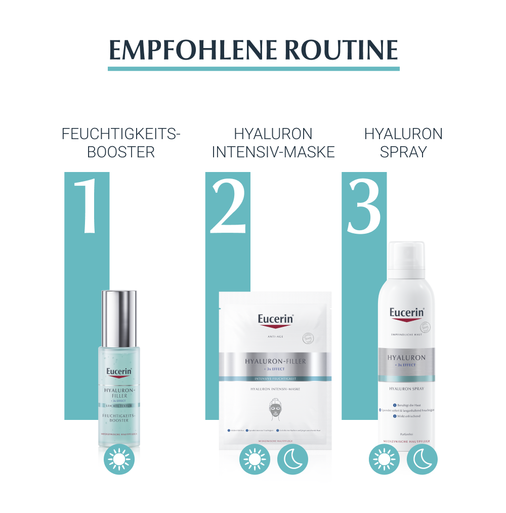 Frische, schöne Haut beim Aufwachen mit dem Eucerin HYALURON-FILLER + 3x EFFECT Feuchtigkeits-Booster Nacht zur Faltenbehandlung. In der Formel mit Über-Nacht-Wirkung wird langkettige Hyaluronsäure, welche in den oberen epidermalen Hautschichten die Feuchtigkeit bindet, mit kurzkettiger Hyaluronsäure kombiniert, die in die tieferen Hautschichten eindringt, wo sich tiefere Falten bilden. Zusammen mit Glycerin wird der Feuchtigkeitsgehalt der Haut signifikant erhöht und ihr bis zu 72 Stunden Feuchtigkeit gespendet.